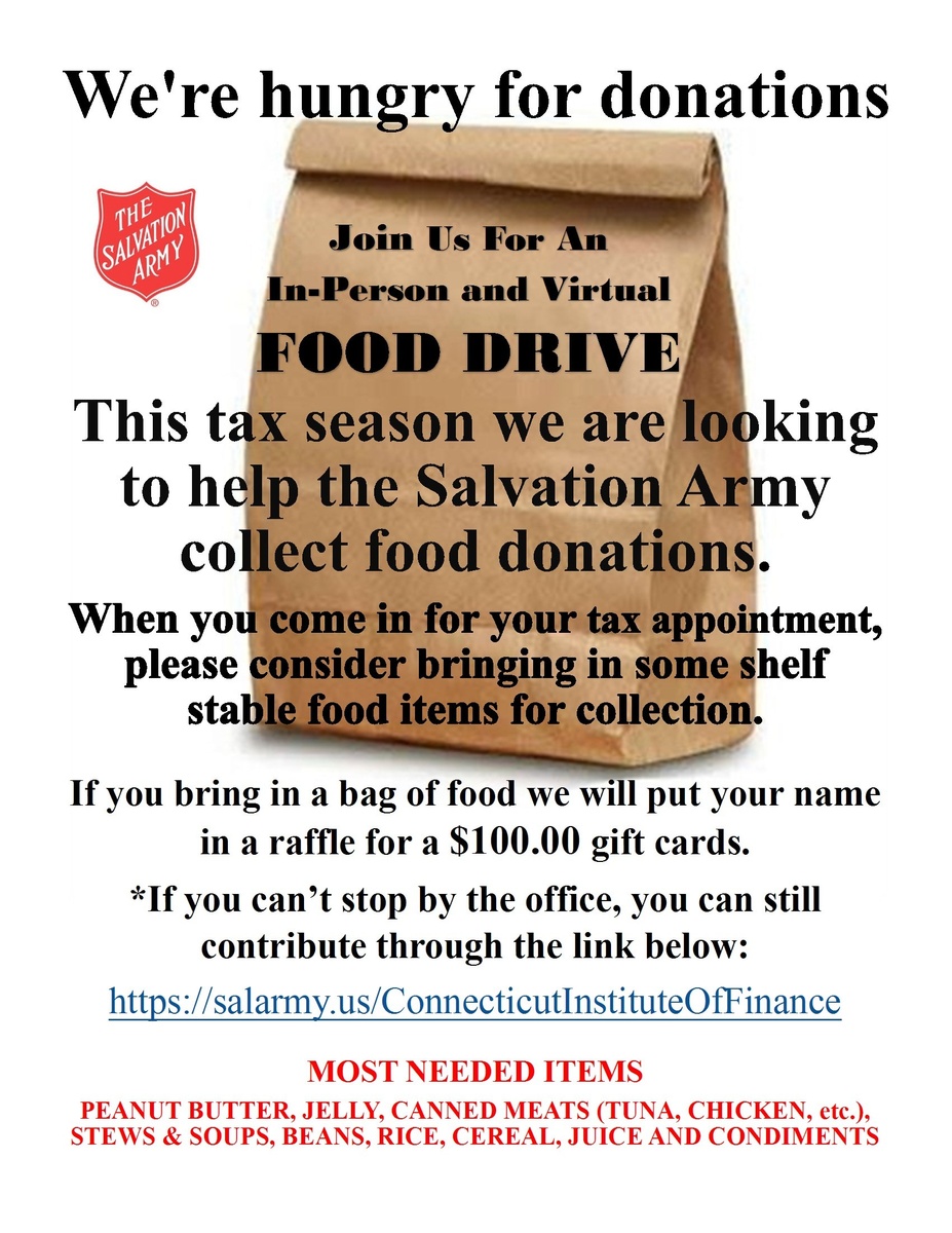 This tax season we are looking to help the Salvation Army collect food donations.